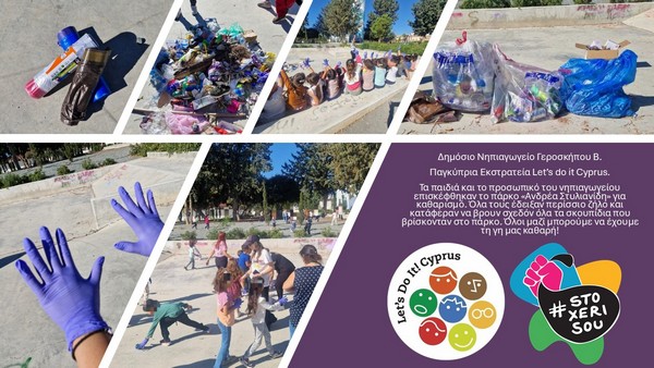 Η δράση Let's do it Cyprus πραγματοποιήθηκε στο σχολείο μας στις 31.10.2025. Τα παιδιά επισκέφθηκαν το πάρκο "Ανδρέα Στυλιανίδη" που βρίσκεται κοντά στο σχολείο μας και όλα μαζί ενωμένα μάζεψαν ό,τι σκουπίδι έβρισκαν. Ακολούθως, τα παιδιά μιας και βρίσκονται σε οικολογικό σχολείο και πάντα προσπαθούν να ανακυκλώνουν, διαχώρισαν τα σκουπίδια που βρήκαν στα ανάλογα σακούλια. Αν όλοι μας γίνουμε μικρά παιδιά με ενσυναίσθηση, τότε ο πλανήτης μας θα ξεκινήσει ξανά να αναπνέει.