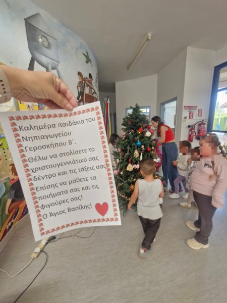 Ο Άγιος Βασίλης επικοινώνησε με το νηπιαγωγείο μας και τα παιδιά κλήθηκαν να φέρουν ένα στολίδι από το σπίτι τους. Το κάθε παιδί έφερε από ένα στολίδι και όλοι μαζί στολίσαμε το χριστουγεννιάτικό μας δέντρο. Η χαρά και τα χαμόγελα ήταν καθ΄ όλη τη διάρκεια ζωγραφισμένα στα πρόσωπα των παιδιών. Αυτές είναι μαγικές μα και μοναδικές στιγμές και για μικρούς και για για μεγάλους. Αρχίζουν τα Χριστούγεννα στο Δημόσιο Νηπιαγωγείο Γεροσκήπου Β......